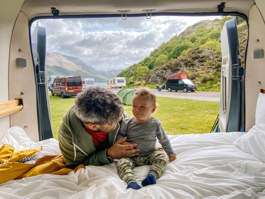 Na co dzień śpimy we troje w jednym łóżku, więc nie odczuliśmy zbyt wielkiej różnicy korzystając z campervana. Mieliśmy dość przestrzeni dla naszej rodziny. Zastanawialiśmy się jedynie nad miejscem dla siebie wieczorami, kiedy nasz syn śpi. W domu mamy salon – a gdzie spędzać wieczory w vanie? Wybierając kierunek taki jak Szkocja, nie możemy liczyć na ciepłe i bezwietrzne wieczory i noce. Późne wieczory spędzamy raczej wewnątrz auta. Otwieraliśmy drzwi łazienkowe i zawieszaliśmy ręcznik, aby do części sypialnianej nie dochodziło światło.
